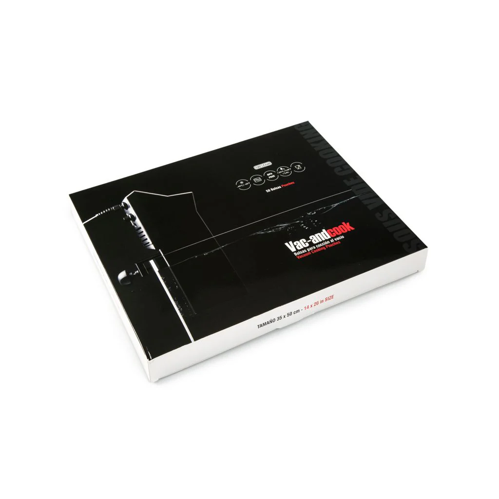 Opbevaringsposer nedbrydes med tiden, når de udsættes for høje temperaturer. De kan modstå omkring 2 timer i 41 ° C til 70 ° C og kun 15 minutter i 71 ° C (160 ° F) til 100 ° C (212 ° F). Ikke alene er dette utilstrækkeligt til madlavning eller pasteurisering, men resulterer også i forurening af mad med kemiske forbindelser og giftige elementer. Derimod modstår Vac & Cook madlavning i vand eller damp, op til 120 ° C i mere end 24 timer, perfekt til madlavning i lave temperaturer. Hver plastik pose er BPA fri, og dens kvalitet er garanteret ved teknisk certificering af hver produktionsserie. Vores Vac & Cook poser fås i 3 forskellige størrelser og 2 typer emballager: Små hygiejnebokse, som beskytter poserne, mens du ikke bruger dem og store økonomikasser, tænkt til stor brug.